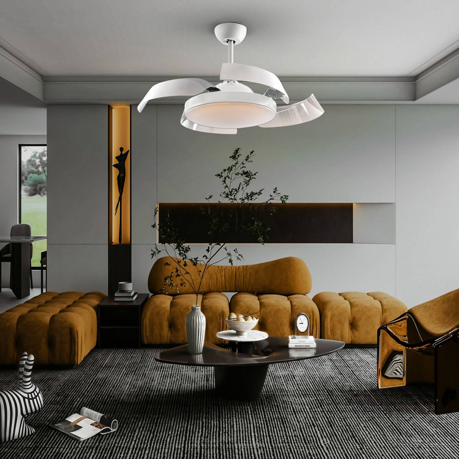 Stropný ventilátor Enzo so zaťahovacími lopatkami a ovládateľným LED svetlomStropný ventilátor Enzo je vybavený stmievateľným LED svetlom, ktorého farbu svetla možno nastaviť od teplej bielej až po denné svetlo. Je vyrobený z kovu a 4 zaťahovacích lopatiek z polomatného akrylu s lesklým vnútrom. Difúzor je tiež vyrobený z opálového akrylu. Enzo má jednosmerný motor so 6 rýchlosťami a spätným chodom. Okrem toho je integrovaný časovač a celkové ovládanie sa vykonáva pomocou priloženého diaľkového ovládača.- Akčný rádius: Ø180 cm (meria sa 140 cm pod ventilátorom)- 35W motor na jednosmerný prúd- 6 rýchlostí. Spätný chod- Hlasitosť: 37/49 dB- Vhodný pre podhľady a normálne stropy