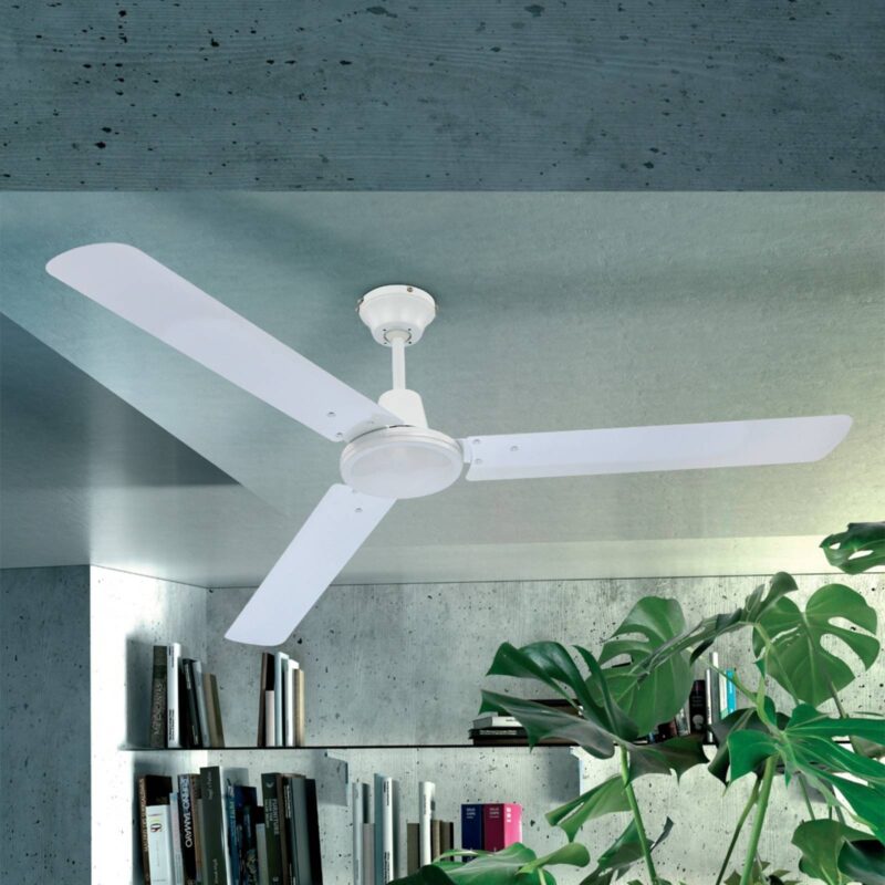 Ferro – jednoduchý stropný ventilátor bielej farby Jednoduchý a moderný, taký je stropný ventilátor Ferro kompletne v bielej farbe. Je vhodný do veľkých priestorov zariadených v rôznych štýloch a na stropy so sklonom max. 30 stupňov. Funkcie Nastaviť možno tri rýchlosti. Ventilátor beží výlučne v lete (pravotočivý chod). Potrebný nástenný vypínač je súčasťou dodávky. Technické údaje Výkon: max. 64 wattov Rýchlosti: 110/190/280 ot./min
