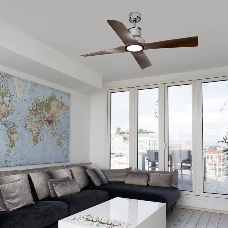 Komfortne vybavený stropný ventilátor Winche Chrómovaný kryt stropného ventilátora Winche je v nápadnom kontraste s plastovými lopatkami vo vzhľade tmavého dreva. Stropný ventilátor Winche, ktorý je vhodný pre miestnosti s rozlohou do 25 m², možno v prípade potreby doplniť aj súpravou osvetlenia (nie je súčasťou dodávky, je k dispozícii ako príslušenstvo). Funkcie Stropný ventilátor Winche, vybavený prúdením dopredu a dozadu, možno prevádzkovať celoročne – v lete na ochladzovanie a v zime na rovnomerné rozvádzanie vzduchu v miestnosti. Prietok vzduchu je 183,01 m³ za minútu. Vrátane diaľkového ovládania. Technické údaje Príkon na rýchlosť: – 3 W pri 48 ot/min – 5 W pri 71 ot/min – 8 W pri 94 ot/min – 12 W pri 116 ot/min – 19 W pri 139 ot/min – 30 W pri 162 ot/min Motor: DC