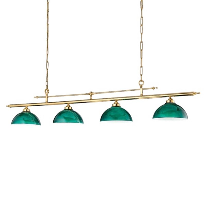Závesné svietidlo Biliardo prináša faktor wow! Závesné svietidlo Biliardo je všetko, len nie obyčajné. Štyri plamene na zlatom, lesklom ráme sú doplnené sklenenými nápadnými zelenými odtieňmi, každý s priemerom 30 cm. Celkovo je Biliardo dlhá 2,01 m, takže je ideálna na použitie nad jedálenským stolom alebo pultom. Táto štýlová lampa by mala byť vybavená LED alebo energeticky úspornými žiarovkami. Svietidlá je možné podľa potreby tiež stlmiť. Benátske umenie osvetlenia, ktoré žije a dýcha – to sa hodí k Biliardu a je tiež typickou charakteristikou talianskeho výrobcu. Toto spája klasické remeselné umenie s modernými detailmi a príslušenstvom, takže sa každé svietidlo stáva pôsobivým konečným produktom.