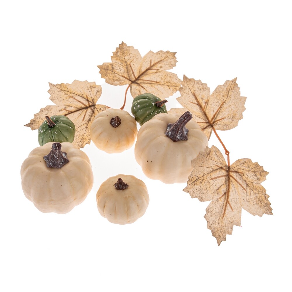 Táto súprava jesenných dekorácií obsahuje celkom 10 malých dekorácií v podobe tekvíc a listov, ktoré dokonale evokujú teplú atmosféru jesenných dní. Vďaka realistickému dizajnu v prírodných farbách vyzerajú dekorácie veľmi autenticky a budú krásnym doplnkom vášho interiéru alebo slávnostne prestretého stola.Balenie obsahuje menšie a väčšie dekoratívne tekvice v jemných odtieňoch smotany a zelenej, doplnené listami s jesennými žilkami. Kombinácia týchto prvkov vytvára harmonický celok, ktorý možno použiť ako samostatnú dekoráciu alebo zakomponovať do vencov, aranžmánov alebo slávnostných stolových dekorácií.Dekoratívna súprava je ideálna nielen do domácností, ale aj do kaviarní, reštaurácií alebo obchodov, kde zvýrazní sezónne dekorácie. Môžete ju použiť na parapetoch, policiach, v dekoratívnych miskách alebo ako prírodný akcent v jesenných kompozíciách.Hlavné výhody produktu: