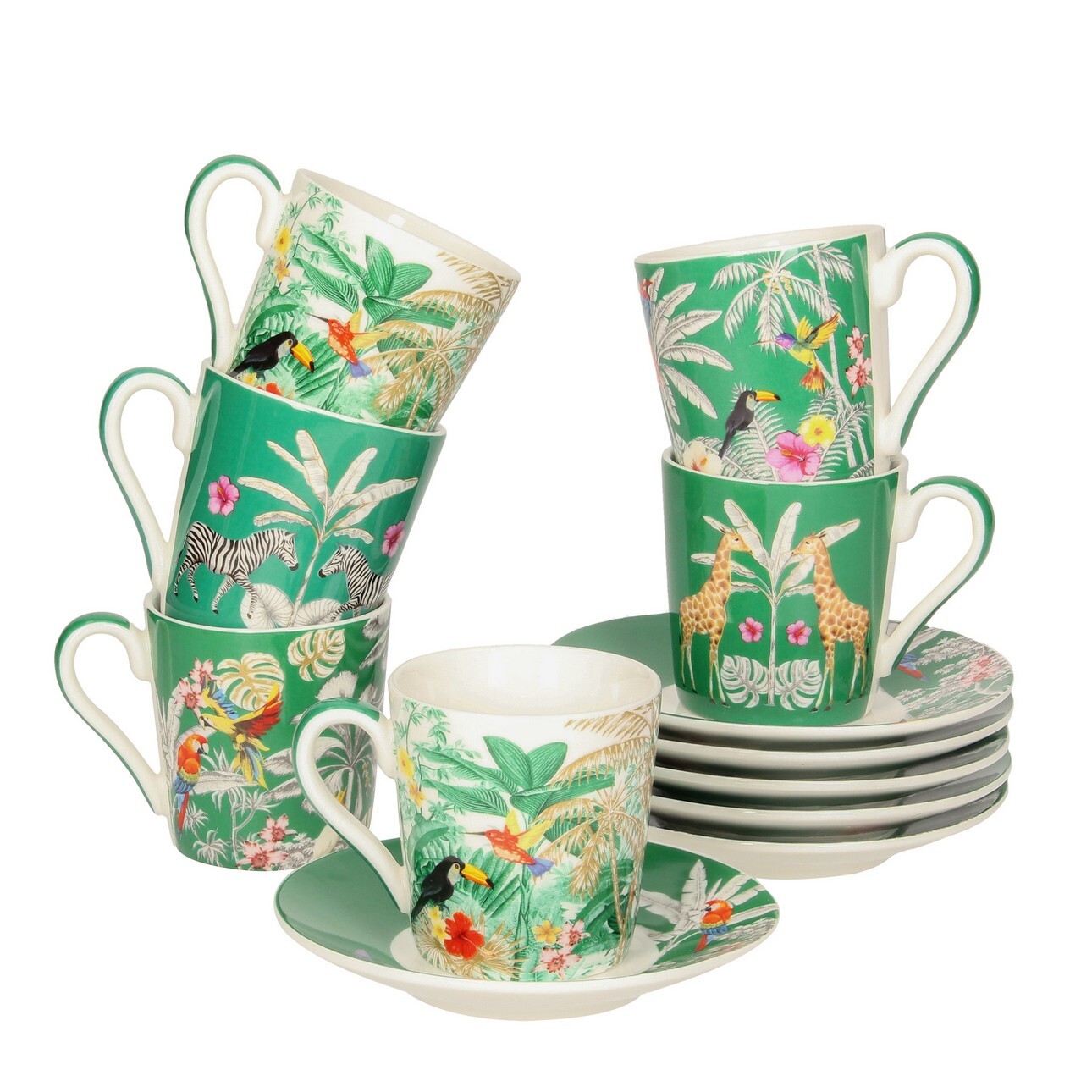 Táto súprava šiestich šálok s podšálkou s exotickým vzorom je určená pre všetkých milovníkov originálneho porcelánu. Servírujte aromatickú kávu atraktívnym spôsobom a užite si chvíle s rodinou a priateľmi. Súprava obsahuje 6 šálok na espresso s podšálkou.Tento darček zabalený v ozdobnej škatuľke je skvelým nápadom na elegantný darček. Výrobok možno umývať v umývačke riadu a používať v mikrovlnnej rúre.Pozrite si ďalšie produkty z tejto série!