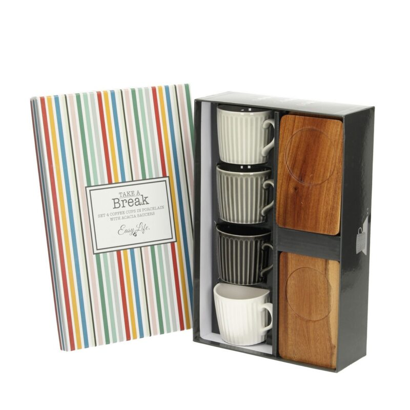 Elegantná súprava štyroch porcelánových šálok v jemných farbách. Jednoduchý dizajn s mierne vymedzenými líniami a podšálky z dreva vytvárajú krásny celok. Ideálne na každodenné použitie pre domácnosť alebo pri návšteve hostí. Porcelánové šálky sú voľbou pre všetkých milovníkov originálneho porcelánu, ktorí ocenia podávanie horúcich nápojov atraktívnym spôsobom. Súprava obsahuje 4 porcelánové šálky s dreveným podšálkom v ozdobnej škatuľke.Súprava Giorno je darčeková súprava šálok na rôzne príležitosti.Výrobok možno umývať v umývačke riadu a používať v mikrovlnnej rúre.Rozmery: Š 8,8 cm, D 6,5 cm, V 6 cm; podšálka: Š 12 cm, D 7,5 cm, V 1 cm.Objem: 100 ml.Materiál: porcelán/akáciové drevo.Farba : čierna/sivá/kapučíno/hnedá.