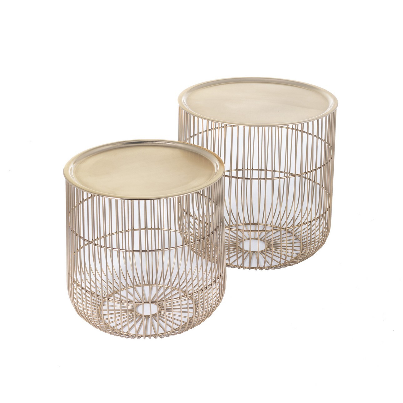 Súprava kovových stolíkov v zlatej farbe.Originálna súprava drevených stolíkov sa stane vkusným doplnkom do vášho interiéru. Súprava úžasne zapadne do miestností zariadených v štýle glamour, loft alebo moderne. Vďaka okrúhlym, odnímateľným doskám majú oba stolíky praktickú funkciu skladovania. Rozmery: veľký stolík: šír. 39 cm, dĺ. 39 cm, výš. 42 cm; malý stolík: šír. 35 cm, dĺ. 35 cm, výš. 36 cm.Materiál: kov.