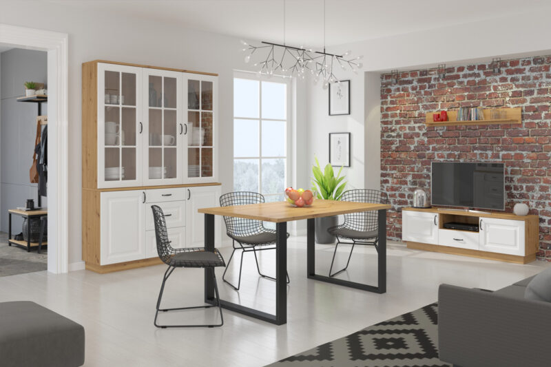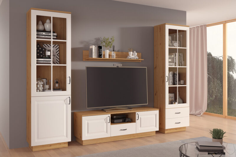 Moderná obývačka SUZY Vás upúta na prvý dojem svojím praktickým nábytkom a nadčasovým farebným prevedením biela a dub artisan. Stavte na nábytok plný sviežosti a vytvorte si domov plný pohody a štýlu.Obývačka SUZY pozostáva z týchto komponentov:- SUZY kombinovaná vitrína 1D2S, rozmery š/v/h: 60/210/37 cm,- SUZY RTV TV stolík, rozmery š/v/h: 150/50/40 cm,- SUZY vysoká vitrína 2D, rozmery š/v/h: 60/210/37 cm,- SUZY polica, rozmery š/v/h: 120/18/17 cm.Nábytok zostavy je vyrobený z veľmi kvalitného MDF materiálu, ktorý sa ľahko udržiava. Predná časť je biela, korpus je dub artisan.Dvierka komody a vitríny majú štýlové kovové úchytky. V ponuke ďalšie prvky sektoru.Dodávame v demonte, pričom montáž je veľmi jednoduchá.