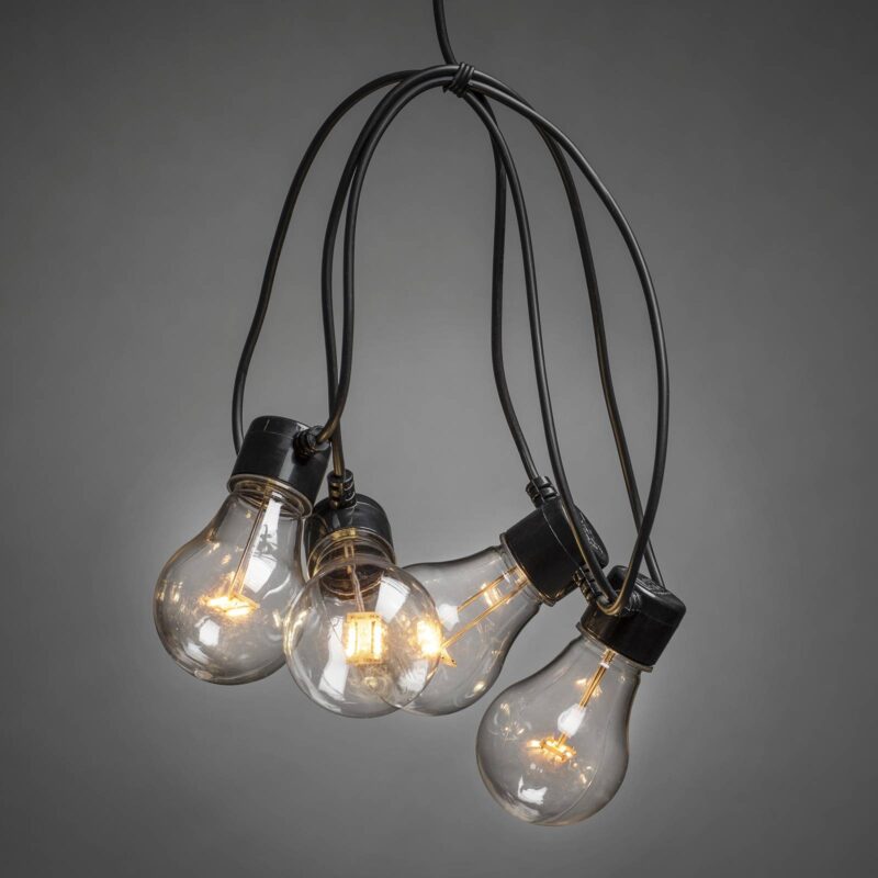 Jantárová svietiaca LED svetelná reťaz pivná záhrada – 20 kusov Táto svetelná reťaz s 20 čírymi žiarovkami dodá každej slávnostnej vonkajšej aktivite tú správnu atmosféru. O to sa stará príjemné svetlo LED diód svietiacich jantárovou farbou svetla. Ideálne párty osvetlenie: Možno ho jednoducho zavesiť napríklad medzi stromy alebo na pergolu. Ale bez ohľadu na to, kde ju nakoniec umiestnite, LED svetelná reťaz pivná záhrada fascinuje fantastickou svetelnou atmosférou, ktorú vytvára. – Transformátor na vonkajšie použitie je súčasťou dodávky