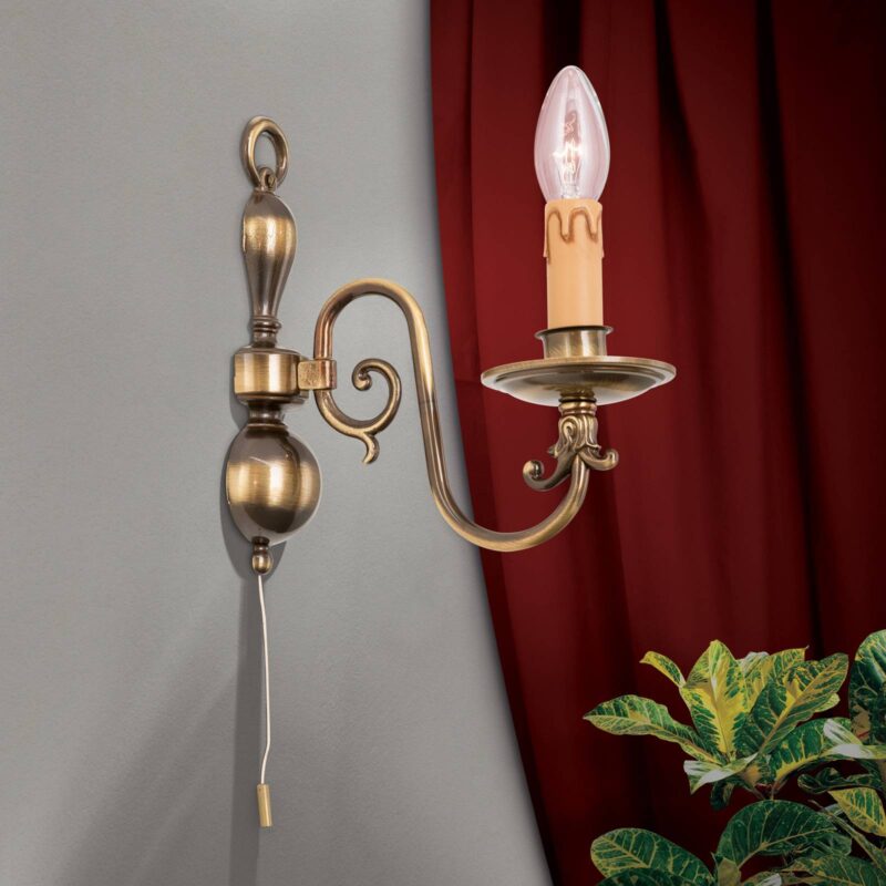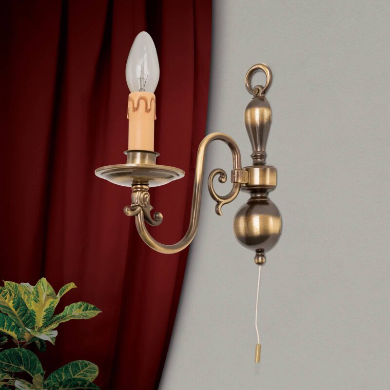 Atraktívne nástenné svietidlo Imke vo flámskom štýle s ťahacím spínačom Nástenné svietidlo Imke je založené na nadčasovo peknom a tradičnom dizajne. Vďaka pravému flámskemu tvaru vás toto nástenné svietidlo očarí pôsobivo tvarovanou nástennou konzolou. Mosadzný materiál má patinovaný vzhľad starej mosadze a je dodatočne ručne tieňovaný. Ako nástenné svietidlo v tvare svietnika pozostáva Imke z misky pod sviečku a držiaka na sviečku. To vytvára tradičnú a starožitnú atmosféru. Decentný ťahací spínač uľahčuje pohodlnú a decentralizovanú obsluhu. Nástenné svietidlo Imke je dokonalé doplnkové svetlo vhodné do sofistikovanej atmosféry a pohodlných interiérových štýlov.