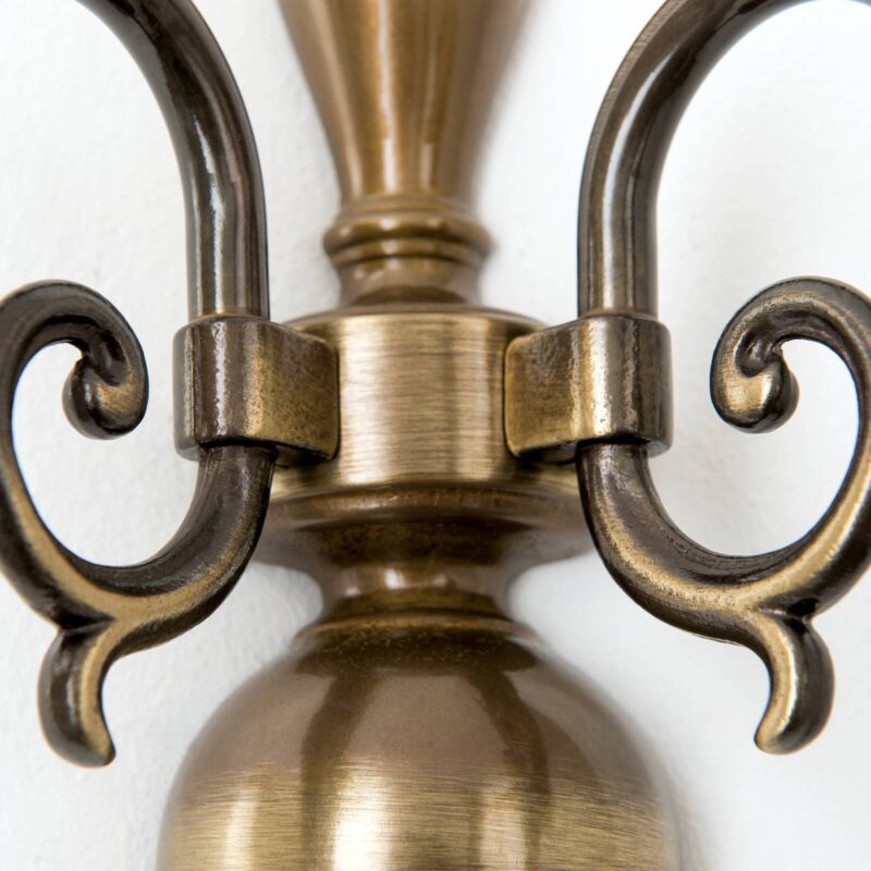 Štýlové nástenné svietidlo IMKE s tmavou mosadznou patinou Nástenné svietidlo IMKE pozostáva z dvoch ramien, ktoré vystupujú doprava a doľava z nástenného držiaka. Svietidlo je vyrobené z masívnej mosadze a má tmavú, starožitne pôsobiacu patinu. Má šírku 35 cm a výšku 16 cm. Vďaka tieňovanému povrchu ramien, ktoré sú špeciálne zdobené a tvarované, dodá miestnosti starožitný charakter. Vhodné na LED alebo energeticky úsporné žiarovky so závitom E14. V prípade potreby je svetlo možné aj tlmiť pomocou samostatného modulu, a tak prispôsobiť osvetlenie okolitým podmienkam. Ideálne ako prídavné osvetlenie chodieb alebo obývačiek.
