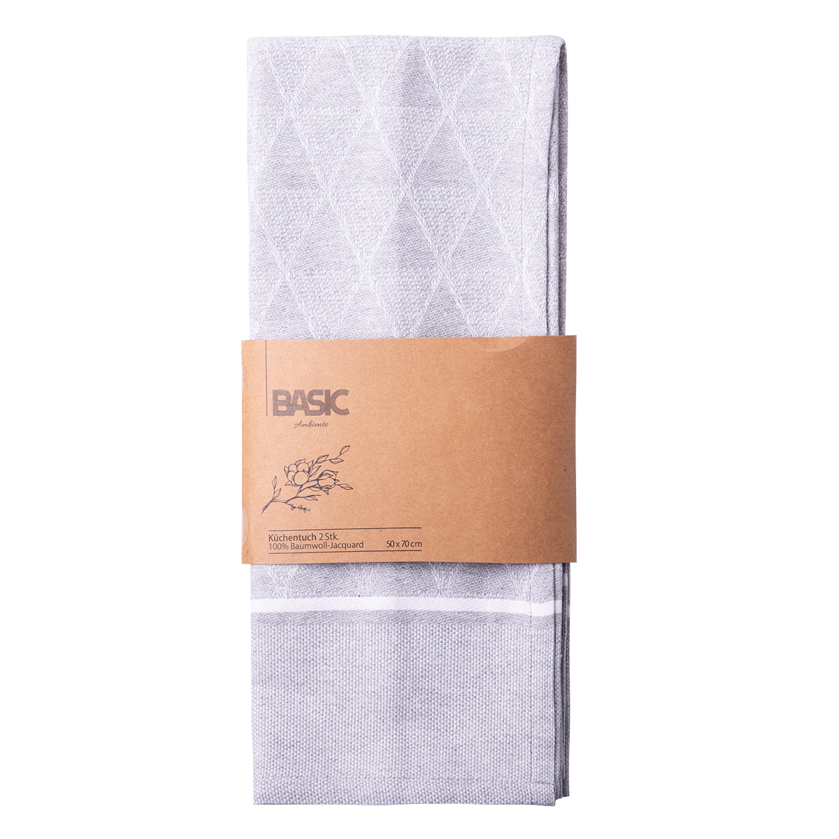 Kuchynská utierka Basic Ambiente s geometrickým vzorom v neutrálnych sivých odtieňoch. Vyrába sa z bavlneného žakáru, ktorý je priedušný, príjemný na dotyk a skvele absorbuje vlhkosť.