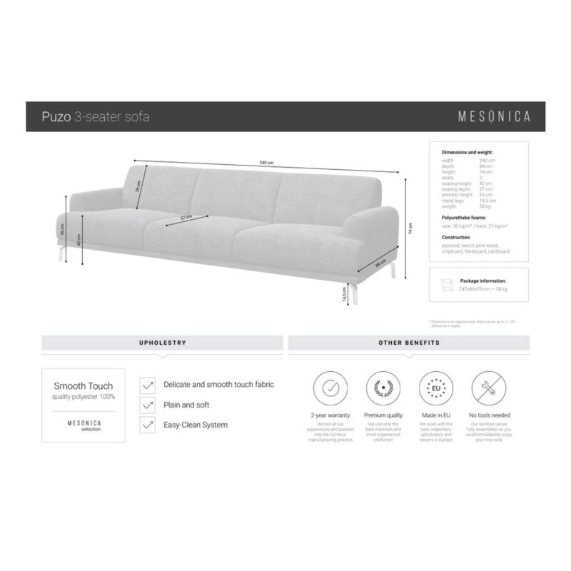 Svetlosivá pohovka MESONICA Puzo, 240 cm