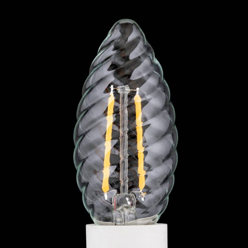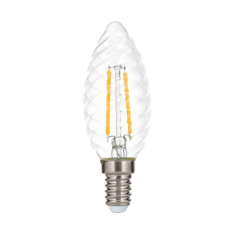 Skrútená LED lampa na sviečku E14 3W 2 700 K Túto skrútenú LED lampu na sviečku s čírou sklenenou žiarovkou a LED vláknami možno ideálne použiť a predviesť v lustroch alebo v nástenných a stolových lampách s dizajnom pripomínajúcim luster. Lampa vyzerá pri zapnutí alebo vypnutí veľmi dekoratívne a vyžaruje teplé biele svetlo, ktoré zodpovedá svetlu bežných žiaroviek. – nedá sa stmievať