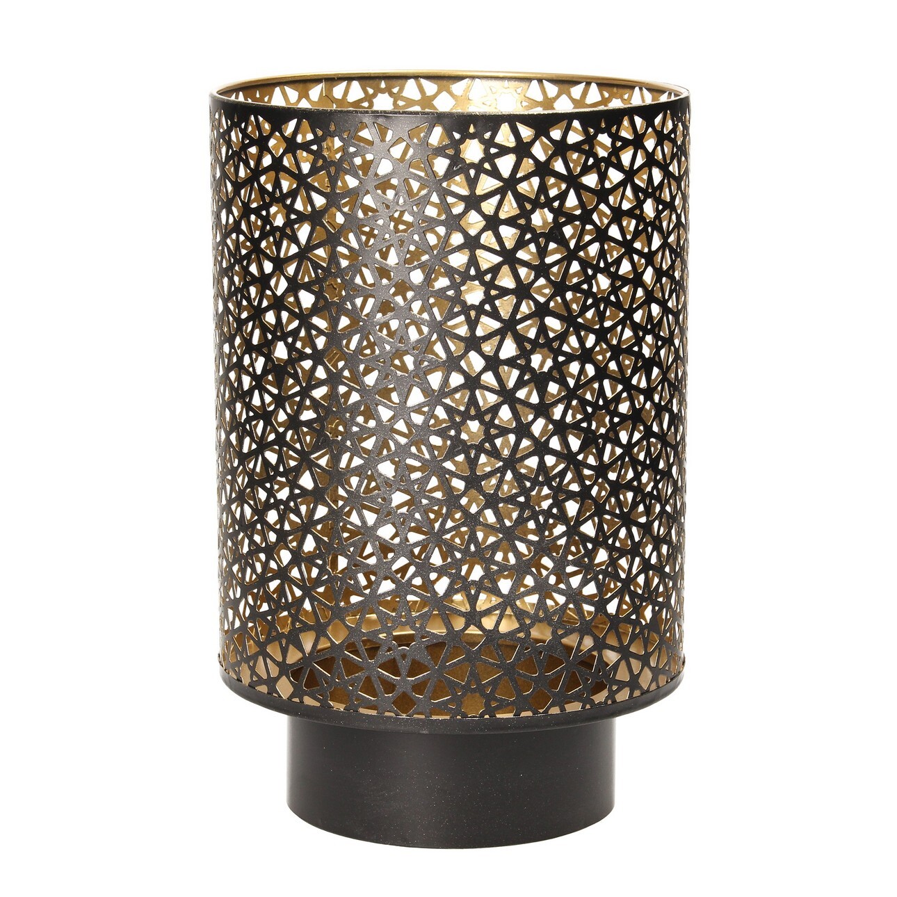 Ažurový svietnik v čiernej a zlatej farbe vyrobený z kovu.