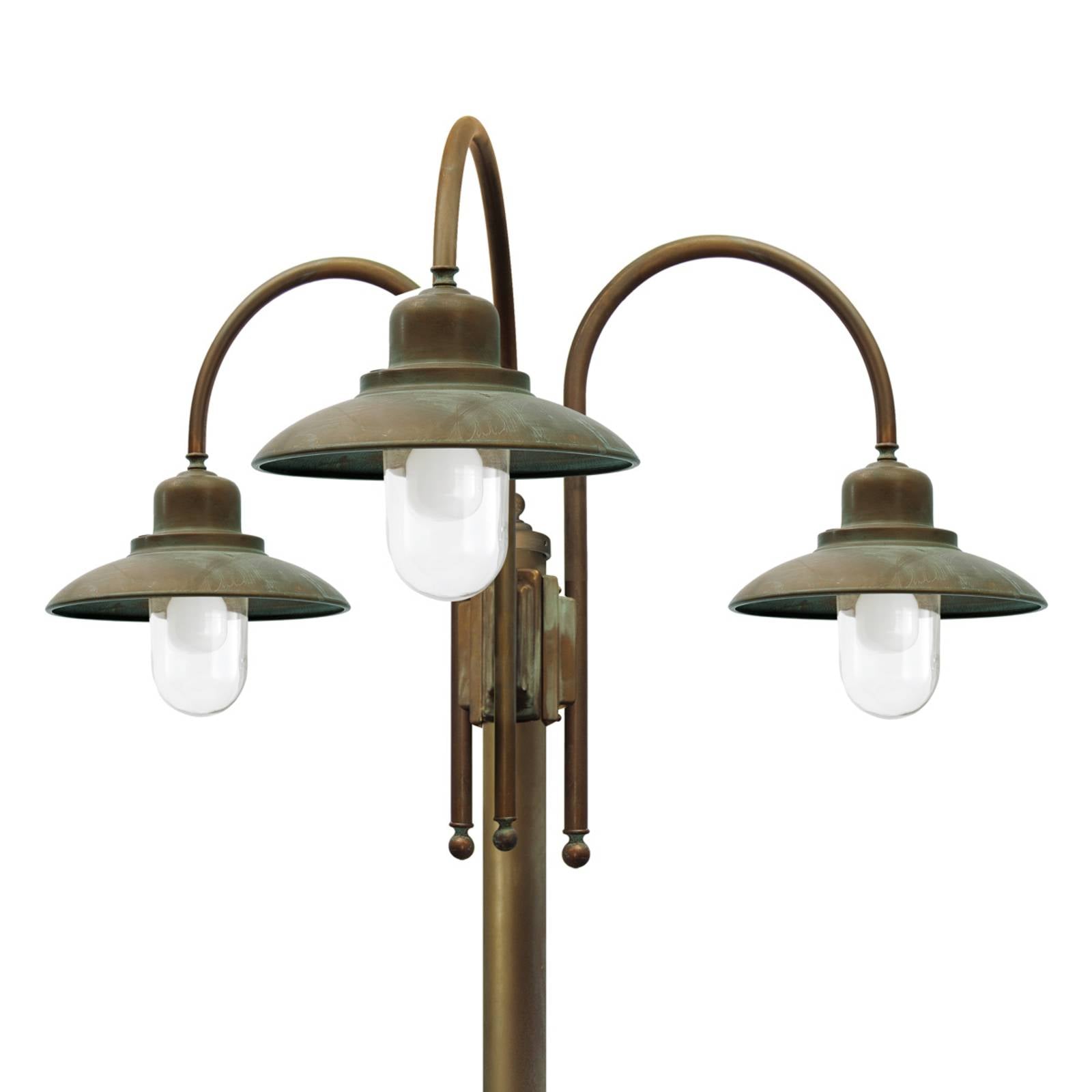 Nádherný trojsviečkový svietnik Casale zo starožitnej mosadze Trojsviečkové stĺpikové svietidlo Casale je ideálne na osvetlenie parkov alebo vonkajších priestorov v klinikách, zariadeniach opatrovateľskej služby alebo domovoch dôchodcov. Svietidlo v stredomorskom štýle je vyrobené z vysokokvalitných materiálov, je odolné voči morskej vode, a preto je vhodné aj na použitie na pobreží. Číre sklo svietidla umožňuje jasné presvetlenie. Okrem halogénových žiaroviek možno stĺpové svietidlo vybaviť aj úspornými žiarovkami alebo LED žiarovkami (pätica E27 – pozri príslušenstvo) na energeticky úsporné osvetlenie.