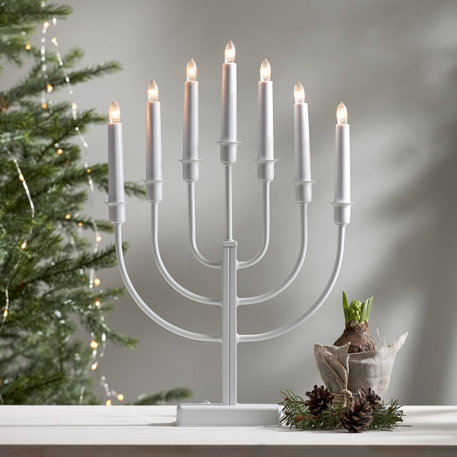 Kristina svietnik so siedmimi bielymi sviečkami Tento svietnik s kovovým telom možno použiť na vytvorenie elegantnej slávnostnej atmosféry. Z najkrajšej oslavy roka urobí skutočný stredobod. So siedmimi bielymi plastovými sviečkami, z ktorých každá má ako plameň žiarovku E10, poskytuje Kristina atmosférické osvetlenie, ktoré vytvára akcenty. Vybavená vypínačom – Prívodný kábel: 1,8 m