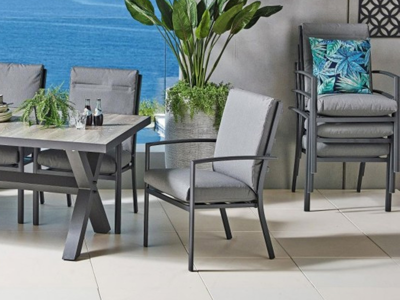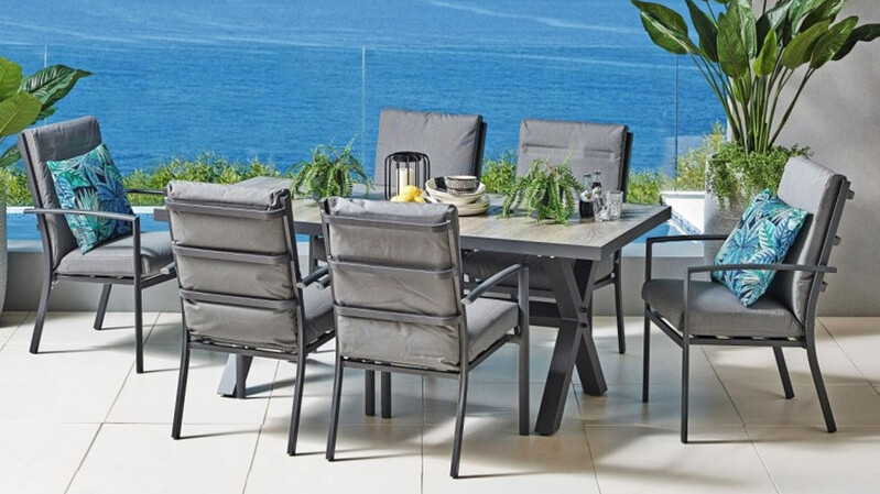 Štýlová záhradná stolová súprava Sydney Lucca s rozťahovacím stolom a šiestimi mimoriadne pohodlnými stoličkami dokonale doplní exteriér.