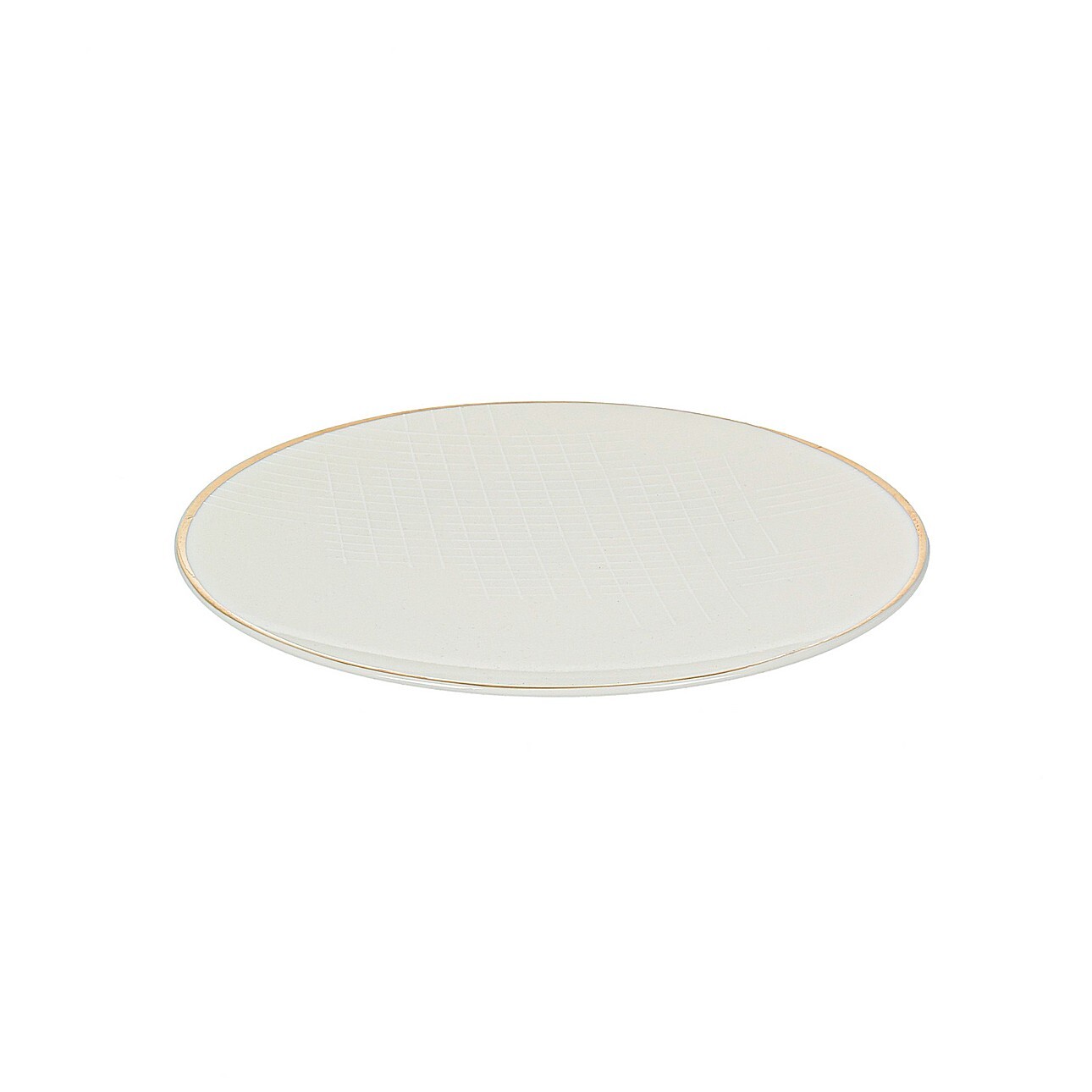 Porcelánový tanier s jemným pozlátením na okraji. Vyznačuje sa klasickým a elegantným dizajnom zdobeným jemným mriežkovým vzorom.