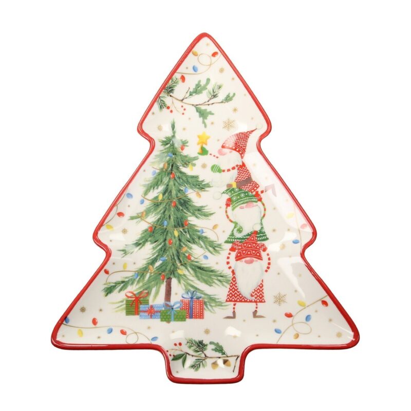 Porcelánový tanier v tvare vianočného stromčeka so slávnostným motívom.Tento tanier v tvare vianočného stromčeka skvele doplní váš prestretý stôl! Krásny sviatočný motív škriatkov oblievajúcich vianočný stromček a krémová farba vytvárajú očarujúci celok. Porcelánový tanier dokonale vyzdvihne všetky vaše štedrovečerné pokrmy.Je zabalený v ozdobnej škatuľke a predstavuje originálny nápad na vianočný darček.Rozmery: šírka 21 cm, dĺžka 26 cm, výška 1,5 cm.Možno umývať v umývačke riadu.Môže sa používať v mikrovlnnej rúre.