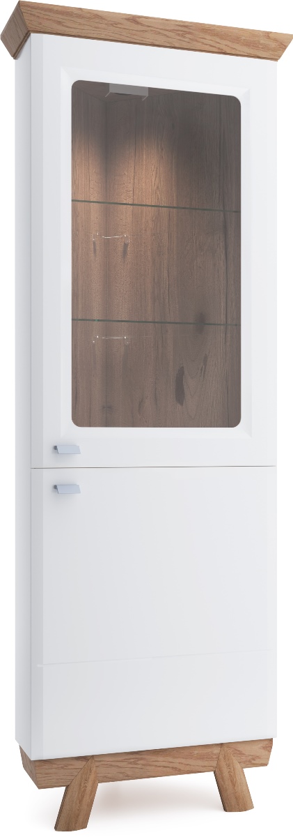 Rohová vitrína s osvetlením ASPEN AS-W/N P patrí k znamenitej a exkluzívnej kolekcii Aspen. Rozmery vitríny sú (ŠxHxV): 67,1×55,3×205,2 cm. Je v pravom prevedení, takže dvierka sa otvárajú do pravej strany. Nežné a elegantné farebné prevedenie bielej vo vysokom lesku v kombinácii s dubom Grande…
