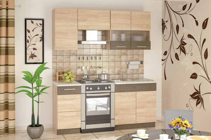 Kuchyňa TATIANA 180 je vhodná do malého priestoru.Je vyrobená z veľmi kvalitnej a ľahko udržateľnej LTD dosky. Farba je dub sonoma s kombináciou tmavého pieskovca. Skrinky ozvláštňujú úchytky strieborného vzhľadu. Zostava obsahuje nasledujúce skrinky: horná 1-dverová 40, horná 1-dverová s výklopným systémom nad digestor 60, horná 2-dverová so sklom 80, dolná s 3 zásuvkami 40, dolná 2-dverová 80 pod drez.Rozmery horných skriniek: – výška: 36/72 cm, – hĺbka: 28,5 cmRozmery dolných skriniek: – výška: 82 cm, – hĺbka: 44,5 cm.V cene sú zahrnuté spodné soklové lišty skriniek.V cene nie je zahrnutý elektrický spotrebič, pracovná doska a drez. Pracovná dosku a drez si môžete zakúpiť, viď doporučenia.Dodávame v demonte, pričom montáž je veľmi jednoduchá.