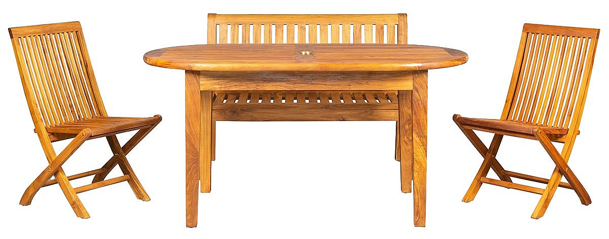 Sestava obsahuje: 1x Teakový stôl DANTE, 2x Skladacia teaková stolička PINA, 1x Teaková lavica PIETRO