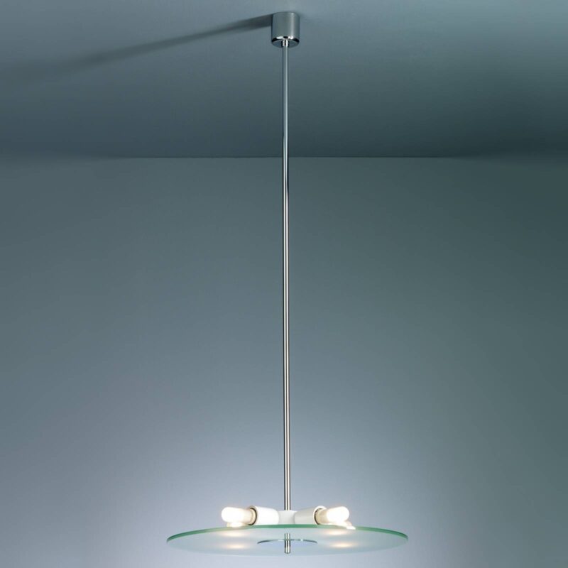 Sklenená závesná lampa Dion vracia štýl Bauhaus späť do obývačky. Jeden z velikánov Bauhausu, Hans Przyrembel, navrhol túto lampu už v roku 1928. Spoločnosť TECNOLUMEN ju teraz ponúka v detailnej reedícii. Dizajn lampy ostáva minimalistický: nad matnou sklenenou platňou sú voľne uložené štyri žiarovky. Svetlo je teda platňou silne tlmené, a šíri sa tak jemne a rovnomerne smerom nadol. Vďaka voľne uloženým žiarovkám sa svetlo tiež odchyľuje nefiltrované smerom nahor a do strán. Zavesenie tvorí matná kovová tyč, ktorá vedie vo vnútri prívod energie. S lampou Dion sa Hansovi Przyrembelovi podarilo už v roku 1928 vytvoriť majstrovské dielo Bauhausu, ktoré aj dnes ešte stále skvele funguje.