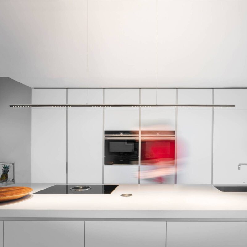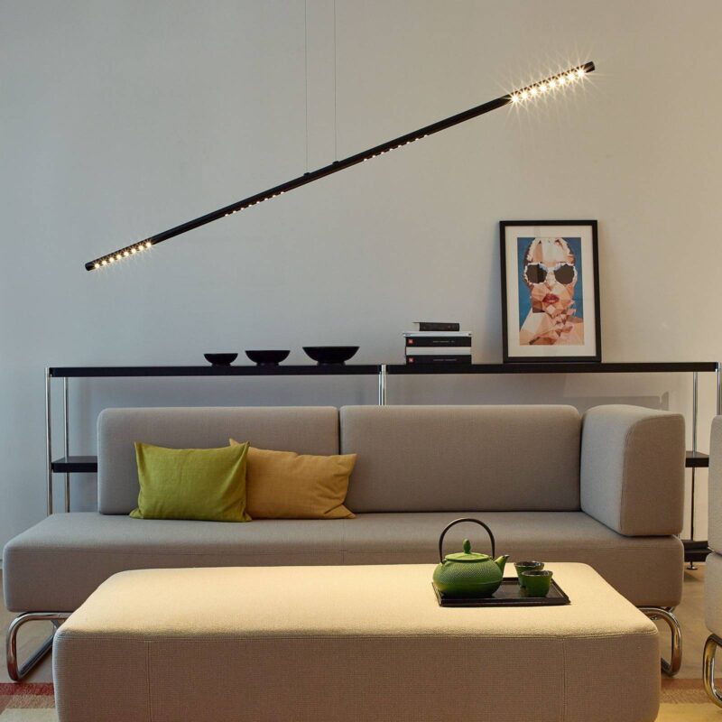 Funkčné závesné LED svietidlo LUM 195 Závesné svietidlo LED LUM 195 je súčasťou dizajnu v štýle Bauhaus a presviedča minimalistickým dizajnom v kombinácii s najnovšími technológiami. Dizajnér Ulf Möller vytvoril svietidlo, ktoré zaujme osobitou funkčnosťou. Vďaka zabudovanému dotykovému ovládaniu možno svietidlo zapínať a vypínať, ako aj stmievať. Ďalšou špeciálnou funkciou je zmena smeru vyžarovania LED diód, takže jednotlivé články LED možno otáčať až o 360. Zabudovaná technológia v kombinácii s mimoriadnou funkčnosťou robí zo svietidla skutočný unikát. – Hlavy LED svietidiel sa dajú otáčať o 360 – Vynikajúce podanie farieb CRI > 92 – vrátane dotykového stmievača – plynulé nastavenie výšky od 65 cm do 200 cm