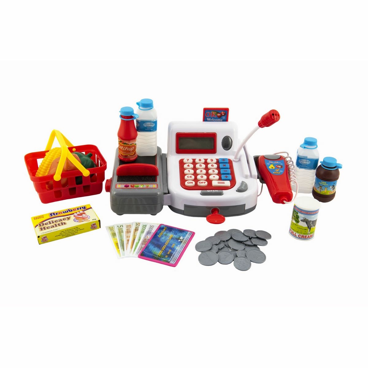 Vďaka tejto funkčnej pokladni so scanerom si môže vytvoriť každá slečna obchod priamo pri sebe v izbe. Súčasťou balenia je aj nákupný košík s množstvom modelového tovaru na nakupovanie a predaj. Je opatrená svetelnými a zvukovými efektmi, takže pomáha rozvíjať detskú fantáziu a manuálnu zručnosť.Napája sa pomocou 2 AA batérií.Balenie obsahuje: pokladňu s pásom, nákupný košík, potraviny, bankovky a mince.
