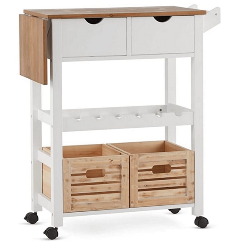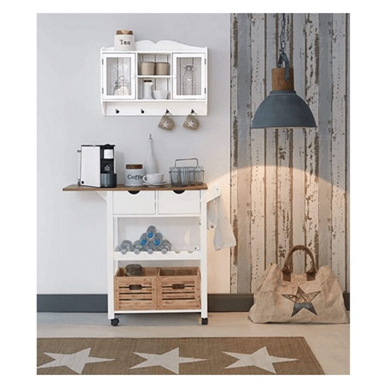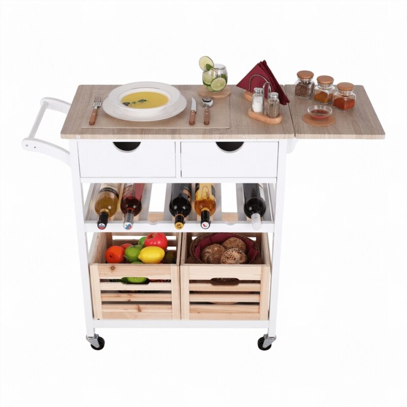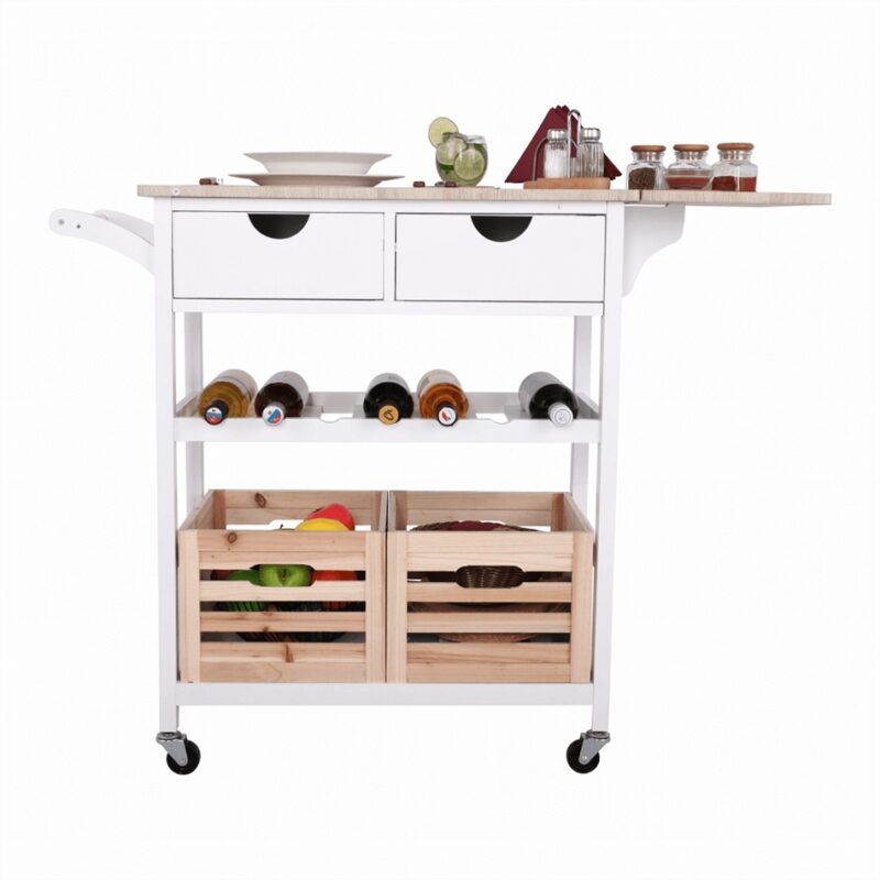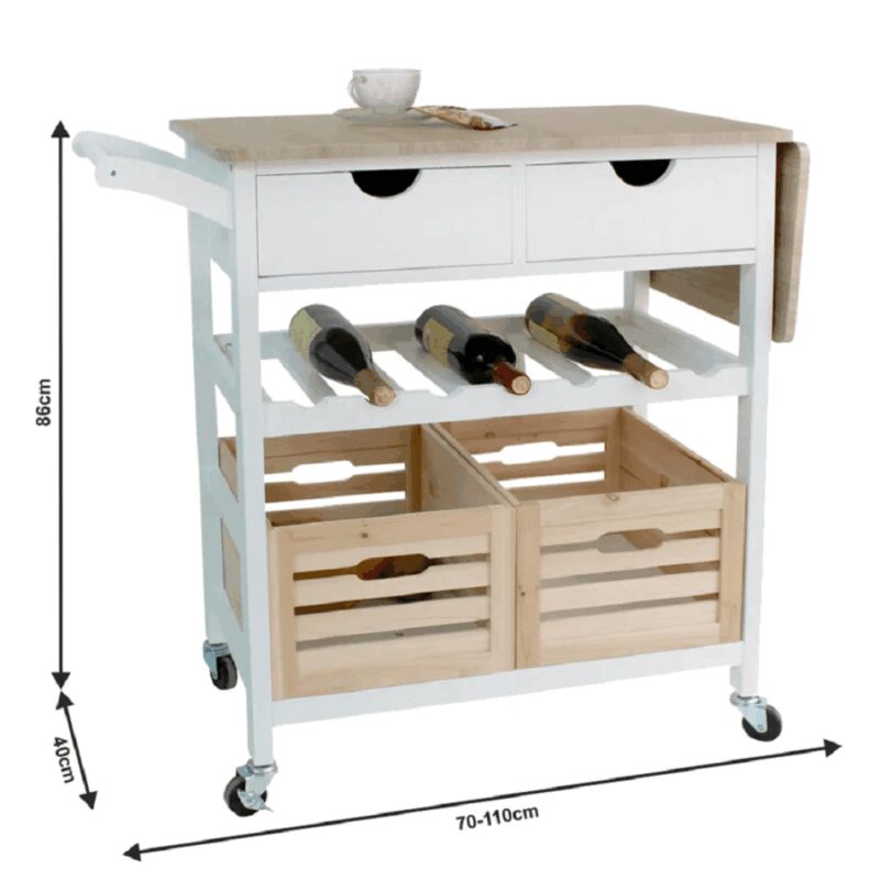 Servírovací vozík je nielen funkčný, ale aj veľmi elegantný. Dva veľké a praktické zásuvky ponúkajú dostatok miesta pre potrebné maličkostí, ako sú vývrtky, obrúsky a iné nevyhnutnosti. Obzvlášť praktické sú držiaky fliaš, ktoré ochránia fľaše pred zvrhnutím a rozbitím. Dva veľké boxy v prírodnom odtieni ponúkajú dostatok priestoru pre uloženie riadu a pohárov.Má sklápaciu pracovnú dosku a držadlo na pohodlné uchopenie vozíku alebo prehodenie utierky.Vyrobené z MFD / drevo / PVC. Dodávame v demonte.