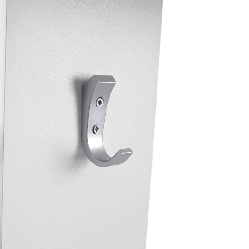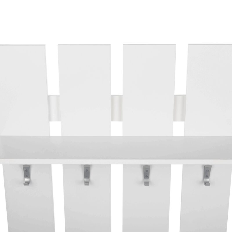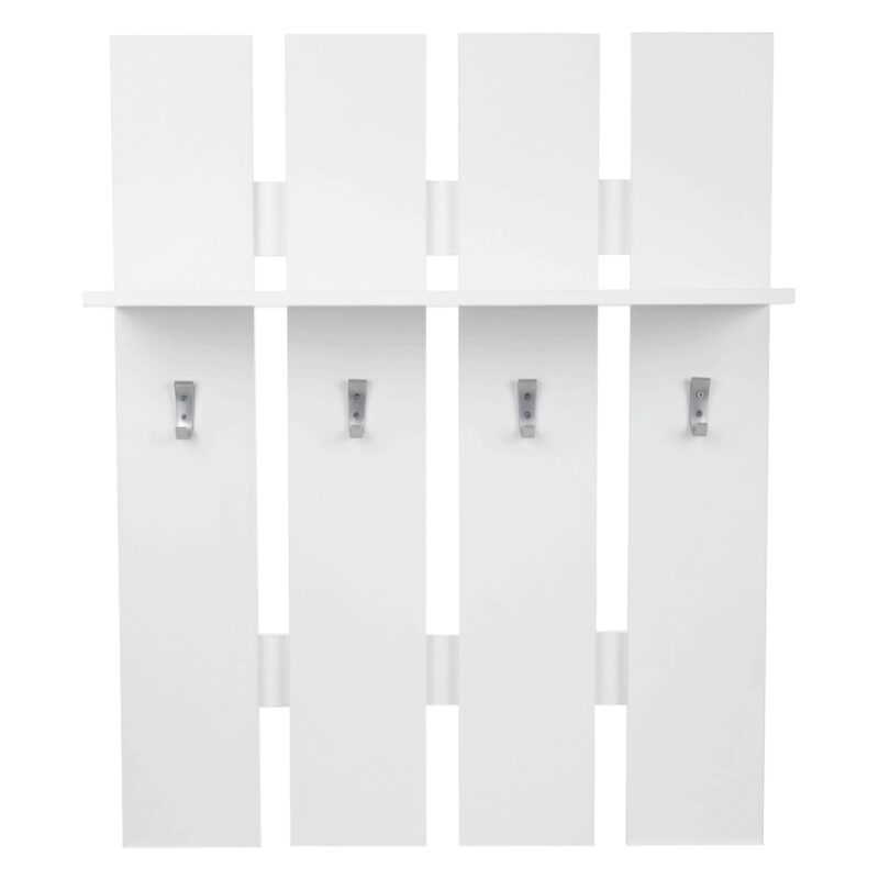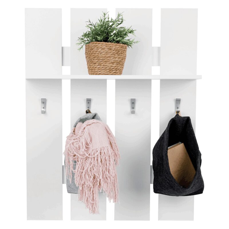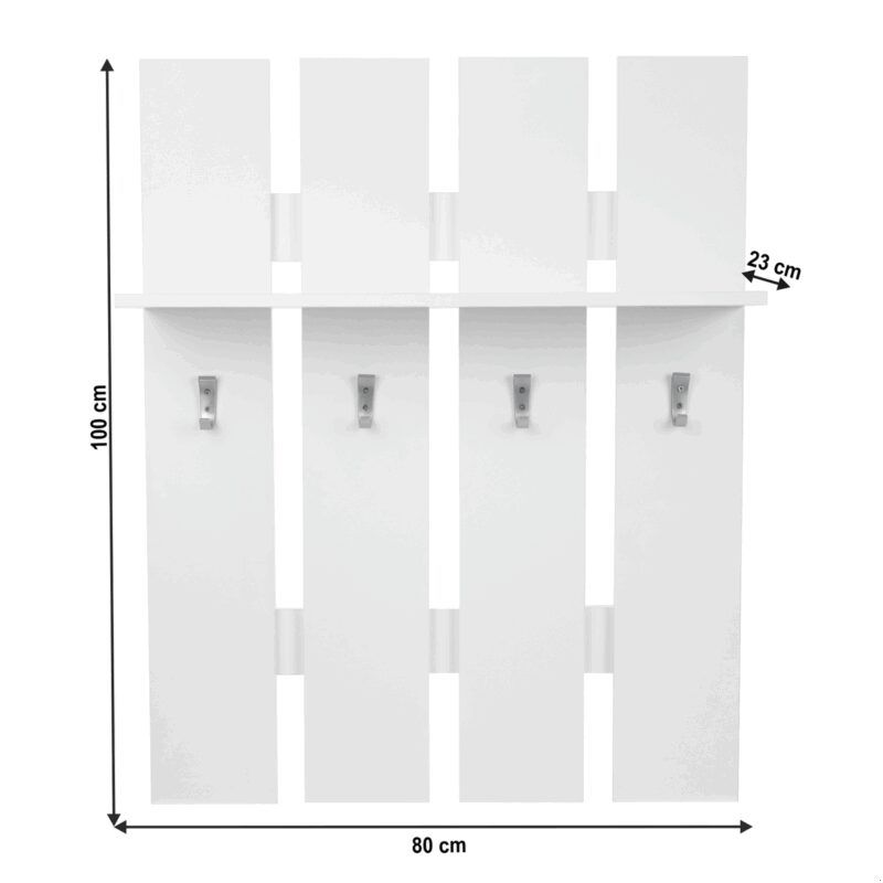 Moderná vešiaková stena Topty 17 v čistom bielom prevedení doplní a tiež oživí váš predsieňový priestor. Súčasne poskytne miesto pre odloženie vrchného odevu vašej návštevy. Je doplnená 4 kovovými háčikmi a praktickou poličkou na odloženie drobností.Materiál: DTD, laminované, biela farba. Hrúbka materiálu – korpus 16 mm. Dodávame v demonte.