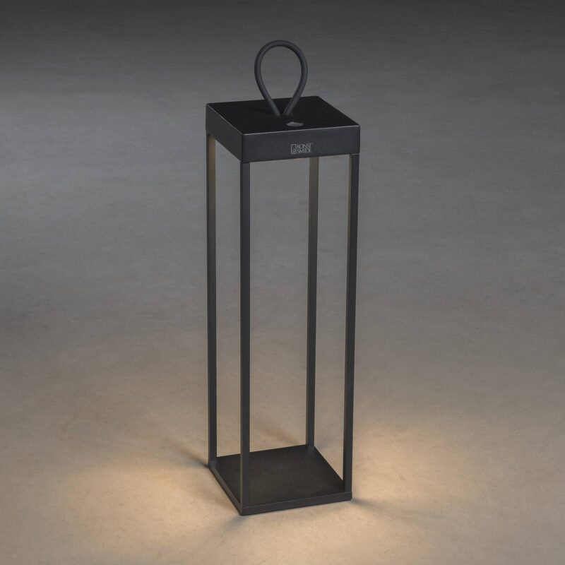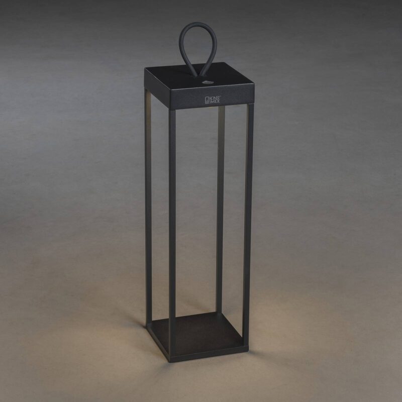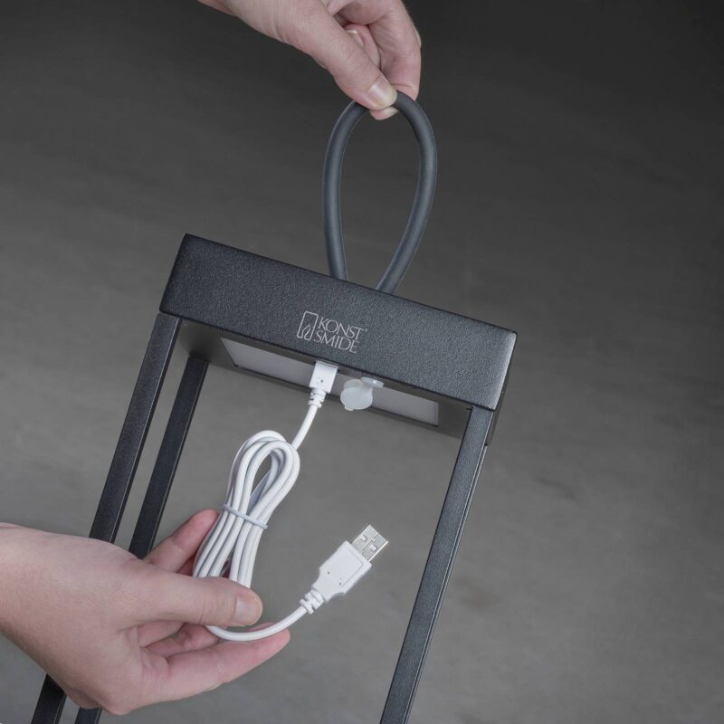 Stmievateľné LED podlahové svietidlo Ravello s batériovou prevádzkou Toto dekoratívne svietidlo na vonkajšie použitie zaujme svojou mobilitou a flexibilným nastavením svetla. Vizuálne pripomína Ravello modernú lucernu v otvorenom čiernom tvare kocky vyrobenú z hliníka. LED diódy sú integrované v hornej časti a osvetľujú vnútro svietidla. Ovláda sa dotykovým spínačom, ktorý okrem zapínania a vypínania svetla umožňuje aj plynulé stmievanie od 100 do 5 % a zmenu teploty farby v rozmedzí od 3 000 do 2 700 K. Integrovaná nabíjateľná batéria umožňuje prevádzku mimo zdroja napájania, zatiaľ čo veľká gumová slučka vás vyzýva na nastavenie terasového svetla na vytvorenie nových svetelných akcentov – vrátane nabíjacieho kábla USB – čas nabíjania: približne 2,5 h – čas svietenia na jedno nabitie: 9 h pri 100 %, 20 h pri 50 % svetelného výkonu