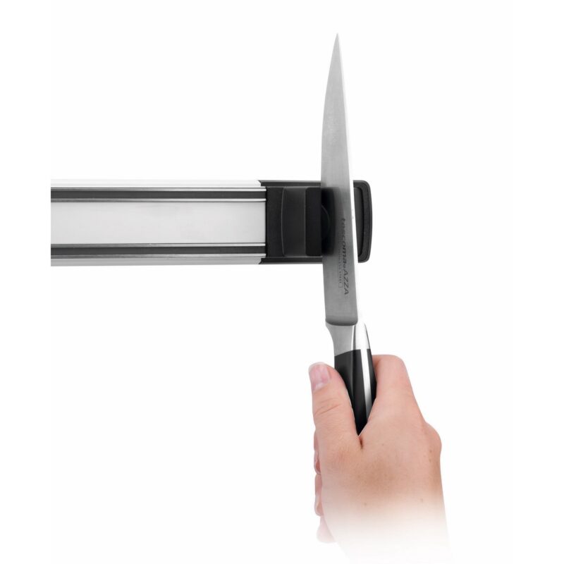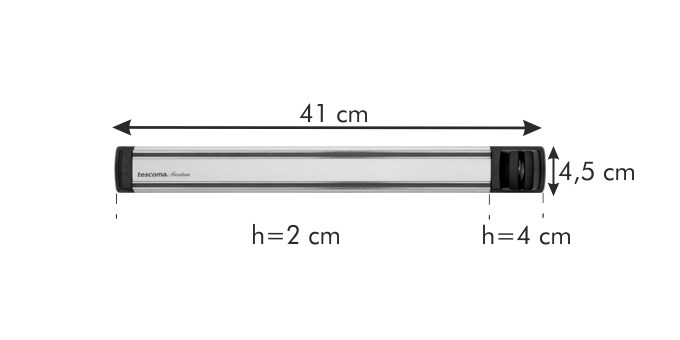 Magnetická lišta na nože PRESIDENT s brúsikom je určená na trvalé umiestnenie na stenu kuchynskej linky. Je opatrená silnými magnetmi pre bezpečné uchytenie 4-6 nožov, kuchynské nože sú na lište uložené bezpečne.Brúsik na kuchynské nože je súčasťou magnetickej lišty, nože sa ostria priamo na lište zvislými ťahmi noža smerom dolu. Brúsne kotúče sú opatrené diamantovým povrchom, brúsenie nožov je rýchle a účinné. Montáž lišty na stenu kuchynskej linky je jednoduchá a je detailne popísaná v návode na použitie, montážne skrutky sú po umiestnení lišty na stenu skryté.POUŽITIE A ÚDRŽBAUkladanie nožovNože ukladajte na lištu vždy čepeľou hore, s potrebnými rozostupmi pre ich bezpečné odoberanie. Maximálne množstvo nožov uložených na lište je 4-6 ks, podľa šírky čepele a veľkosti rukoväte. Magnetickú lištu nepoužívajte na ukladanie nožov s čepeľou dlhšou ako 22 cm, napr. nože na šunku a pod., ani na odkladanie nožov s extra pružnou čepeľou, napr. filetovacie nože a pod.Brúsenie nožovNôž vložte ostrím medzi brúsne kotúče a plynulými ťahmi smerom dole ho nabrúste. Pred uložením nabrúseného noža späť na lištu zbavte čepeľ brúsneho prachu.Materiál: prvotriedna nehrdzavejúca oceľ, eloxovaný hliník a odolný plast.Údržba: v prípade potreby utrite vlhkou utierkou a osušte.