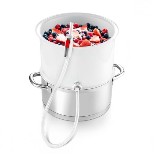 Predstavujeme unikátny odšťavovač, ktorý je vynikajúci pre jednoduchú a rýchlu prípravu domácich ovocných a zeleninových sirupov, prírodných ovocných štiav, želé a džemov v bežnom kuchynskom nehrdzavejúcom riade, to znamená hrncoch a hrncoch s pokrievkou s priemerom 24 cm.So sadou pre odšťavovanie DELLA CASA nemusíte kupovať špeciálne odšťavovací hrniec, ale jednoducho použijete bežný nehrdzavejúci hrniec alebo kastról s pokrievkou s priemerom 24 cm. Jeden z tých, ktoré už doma máte a pravidelne používate. V sade DELLA CASA môžete naraz odsťaviť až 1 kg čerstvého alebo mrazeného ovocia či zeleniny.Pre odšťavovanie v sade DELLA CASA sa výborne hodia jahody, ríbezle, egreše, maliny, čučoriedky, čierny bez, brusnice, hrozno, jablká, hrušky, višne, čerešne, marhule, slivky, broskyne, tekvica, rebarbora a pod., Z ktorých v parnom odšťavovači ľahko pripravíte domáce ovocné a zeleninové sirupy.Sada pre odšťavovanie DELLA CASA je opatrená kvalitnou silikónovou hadičkou s uzáverom pre pohodlné stáčanie pripravených sirupov a štiav do fliaš. A nielen to: