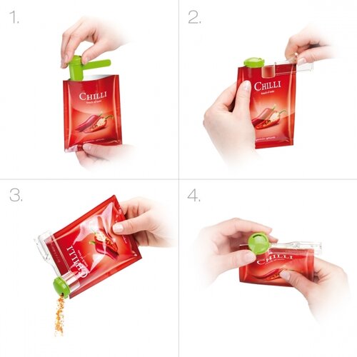 Vďaka týmto násypkám možno pokrmy z vreciek dochucovať bez nebezpečenstva vysypania nechtiac veľkého množstva korenia do pokrmu. Výhodou je, že korenie vo vreckách uzavretých násypouy pri skladovaní nevlhne a nezvetrá. Násypky sú vynikajúce pre dochucovanie pokrmov priamo z vreciek s korením a uzavretie vreciek pri skladovaní.
