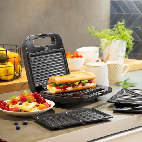 Máme pre vás vychytaný sendvičovač s vymeniteľnými zapekacími a grilovacími doskami, s ktorým môžete pripravovať oveľa viac než len sendviče z toastového chleba. Vďaka 3 typom dosiek je skvelý aj pre prípravu domácich pečených vaflí, zapekanie plnených bagiet „panini“ aj pre šetrné grilovanie zeleniny, mäsa a rýb.Výmeniteľné dosky s prvotriednym antiadhéznym povlakom proti pripaľovaniu zo sendvičovača ľahko vyberiete stlačením jediného tlačidla. Vybraté zapekacie a grilovacie dosky môžete po každom použití dokonale vyčistiť pod tečúcu vodu. Celý spotrebič možno pre úsporu miesta skladovať vo zvislej polohe. Materiály použité na výrobu spotrebiča sú nehrdzavejúca oceľ, kvalitný kov a tepelne odolný plast.