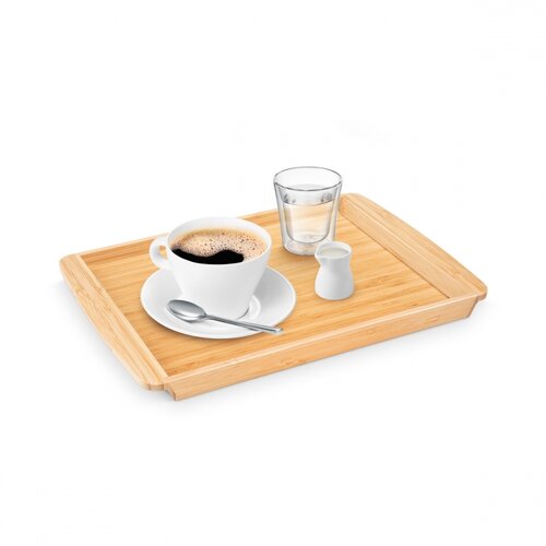 Je kompaktný a súčasne priestranný, ideálny ako servírovací podnos pre horúce nápoje, napr. kávu vrátane nádoby na mlieko, vodu a cukorničku. Hodí sa výborne aj na servírovanie menších pokrmov, napr. dezertov a desiat. Podnos ONLINE má zvýšené a na dvoch protiľahlých stranách predĺžené okraje pre komfortné a bezpečné prenášanie. Materiál: prírodné bambusové drevo. Čistenie: čistite vlhkou utierkou, neumývajte v umývačke.