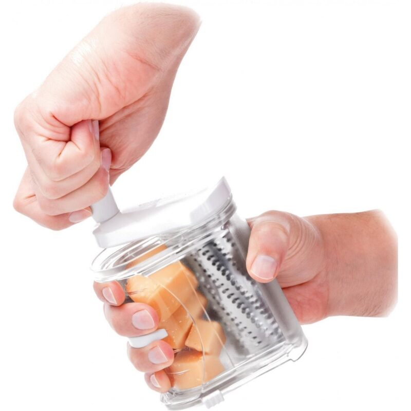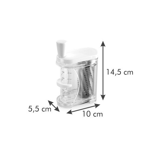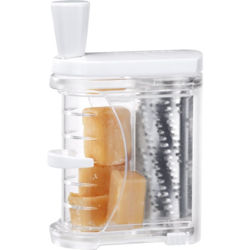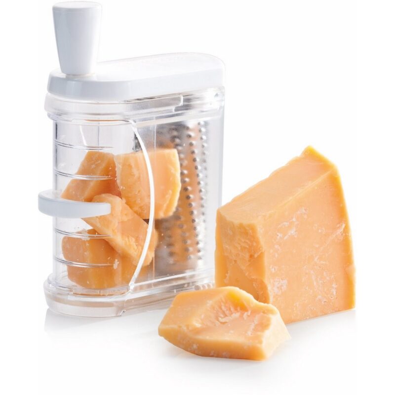Vynikajúce pre ľahké strúhanie parmezánu a ďalších vhodných syrov priamo na pokrmy. Po použití možno strúhadlo uzavrieť a skladovať v chladničke, nespotrebovaný syr neosychá, nevysypává sa a je pripravený na ďalšie použitie. Čepeľ je vyrobená z prvotriednej nehrdzavejúcej ocele, ostatné časti z odolného plastu. 3 roky záruka.Rozmery: 5,7 × 13 × 22 cm