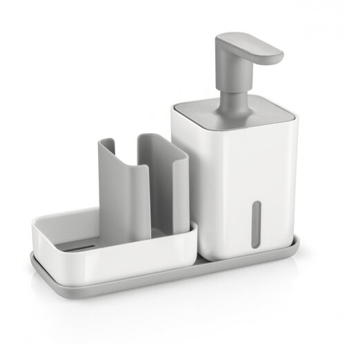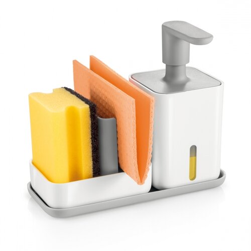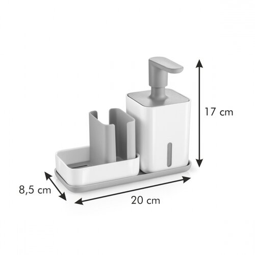 odkladaciu misku PURODávkovač s objemom 400 ml pojme dostatočné množstvo saponátu pre každodenné umývanie bez nutnosti častého doplňovania. Má priestranné a pohodlné tlačidlo s dostatočne dlhou tryskou pre presné dávkovanie, plnenie dávkovača je ľahké. Vďaka priezoru v nádobe môžete množstvo zostávajúcej náplne priebežne kontrolovať a včas doplniť.Zásobník slúži na prehľadné a zároveň hygienické odkladanie hubových utierok a hubiek na riad. Má vyberateľnú odkvapkávaciu vložku, ktorá urýchľuje schnutie a uľahčuje čistenie zásobníka. Pre dokonalé preschnutie sa utierka aj hubka vkladajú do zásobníka vo vertikálnej polohe. Dno zásobníka má protišmykovú ochranu.Odkladacia miska s protišmykovou úpravou dna umožňuje prehľadné odkladanie dávkovača a zásobníka v blízkosti drezu a s maximálnou úsporou miesta. Pre odvod vlhkosti spod uloženého dávkovača a zásobníka má miska profilované dno.