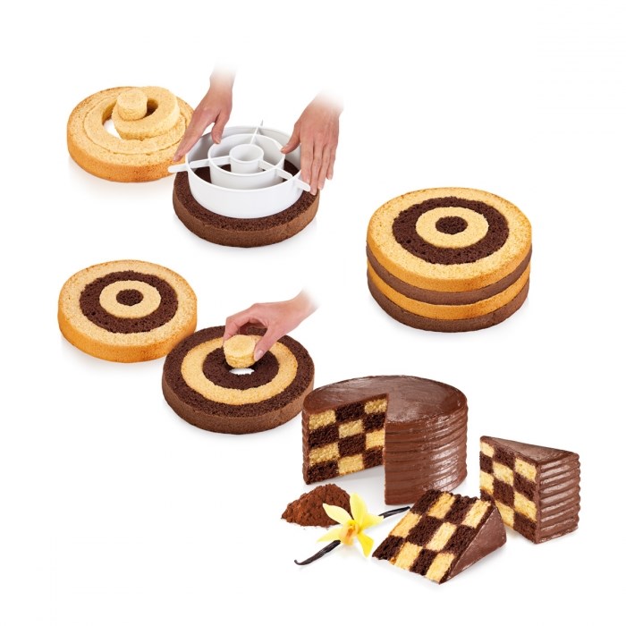 Ak chcete svojho oslávenca potešiť naozaj netradičnou a atraktívnou tortou, upečte mu šachovnicovú alebo dúhovú tortu. S tvorítkom DELÍCIA ju pripravíte ľahko a rýchlo. Príprava takýchto tort je bez formičky zložitá a časovo náročná.Šachovnicové torty sa pripravujú z dvoch vopred upečených tortových korpusov (priemer 18 alebo 26 cm), tmavého a svetlého. Tvorítkom vykrojíte z korpusov tmavé a svetlé kruhy a ich kombinovaním zostavíte šachovnicovú tortu.Dúhové torty pripravíte z cesta rôznych farieb, ktoré sa pri nalievaní do formy s priemerom 18, 20, 26 alebo 28 cm vďaka tvorítku vzájomne nepremiešajú.Výhody: