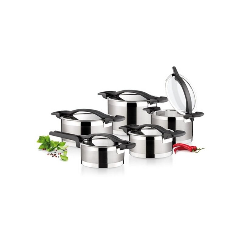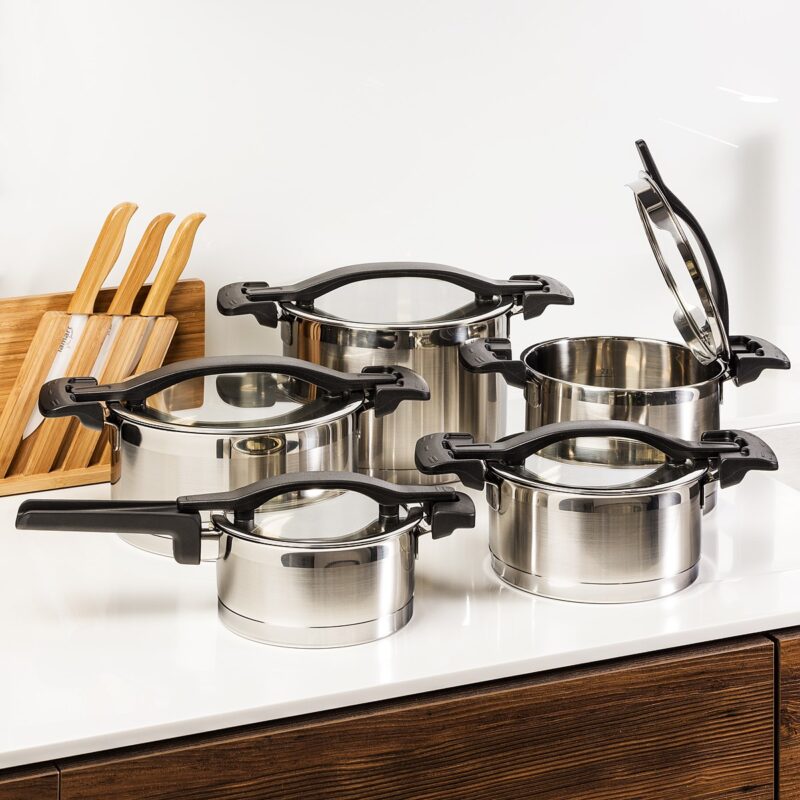 Luxusný riad Tescoma ULTIMA s revolučným systémom regulácie pary a cedenia pre ešte jednoduchšie varenie. Kompletná sada obsahuje 5 hrncov rôznych veľkostí s pokrievkami.Unikátna sklonehrdzavejúca pokrievka s 3 pracovnými polohami: