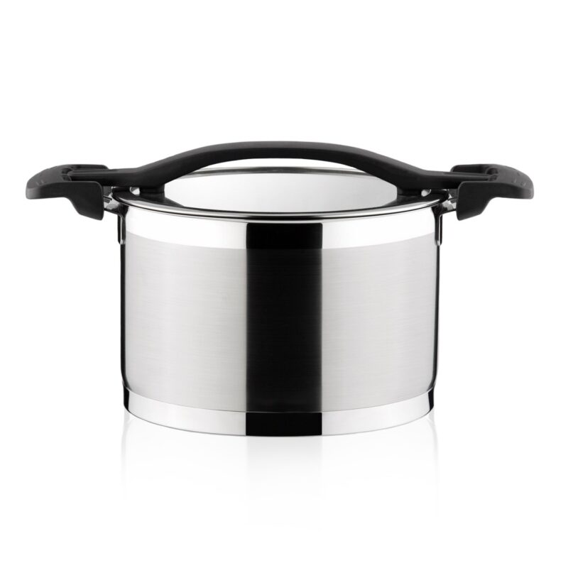 Tescoma ULTIMA hrniec s pokrievkou 7 l. Luxusný kuchynský riad Tescoma Ultima s revolučným systémom regulácie pary a cedenia. Unikátna sklonerezová pokrievka s 3 pracovnými polohami:1. ŽIADNÝ OTVOR NA PARU pre rýchle dosiahnutie varu a ohrievania pokrmov s úsporou energie. 2. MALÝ OTVOR NA PARU pre komfortné varenie bez prekypenia a cedenia nadrobno krájanej zeleniny. 3. VELKÝ OTVOR NA CEDENIE zemiakov, cestovín a pre intenzívne varenie bez prekypenia. Pokrievku možno odkladať do úchytov, para steká späť do riadu. Vybavená extra silným sendvičovým dnom, stupnicou pre ľahké odmeriavanie a úchytmi z odolného plastu. Vyrobená z prvotriednej nehrdzavejúcej ocele 18/10. 5 rokov záruka.