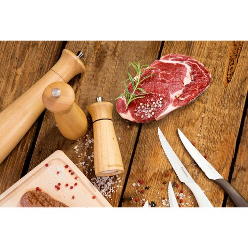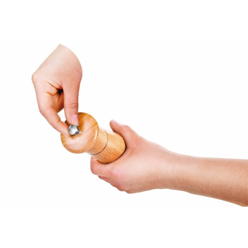 Vynikajúci pre dochucovanie pokrmov čerstvo mletým čiernym korením a čerstvo mletou soľou.Mlynček na korenie/soľ je dodávaný s 2 rozlišovacími krúžkami, čierny krúžok sa na mlynček nasadí pri použití s korením, biely s hrubozrnnou soľou. Mlynčeky na korenie a soľ VIRGO WOOD sú opatrené prvotriednym keramickým mlecím mechanizmom s nastaviteľnou hrubosťou mletia. Mlynčeky čistite vlhkou utierkou a osušte, neumývajte v umývačke.Materiál: vyrobené z ušľachtilého dreva gumovníka brazílskeho (Hevea brasiliensis)s keramickým mlecím mechanizmom.
