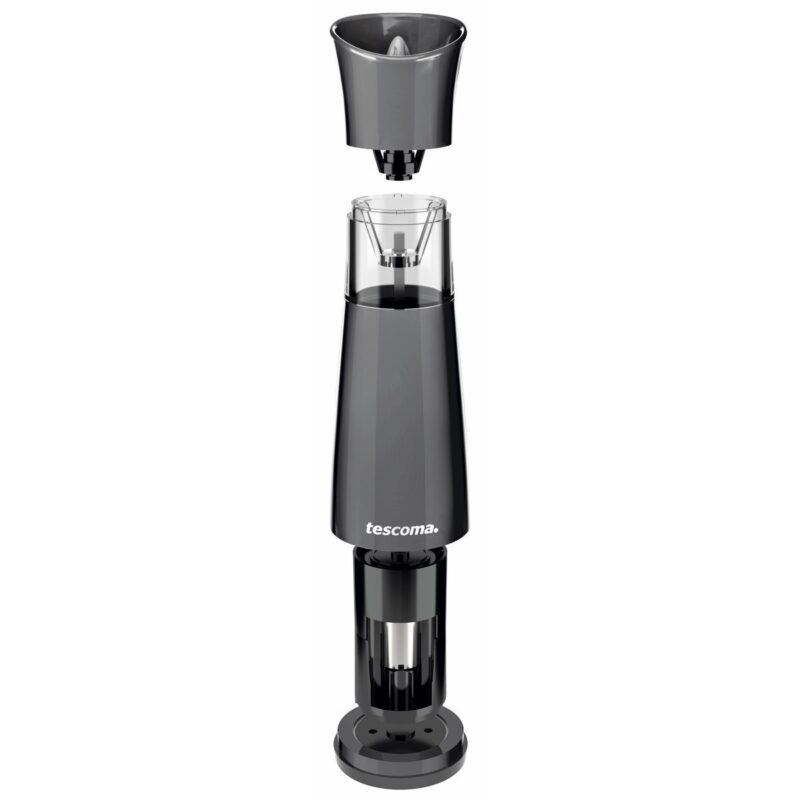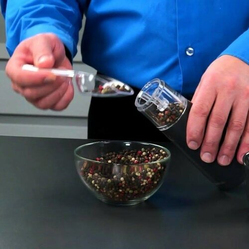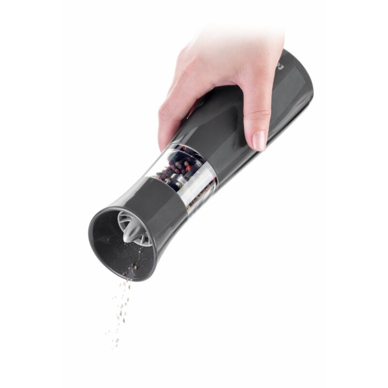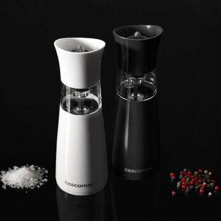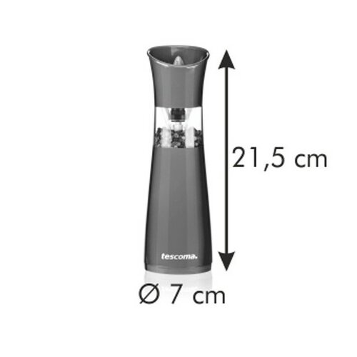Tescoma VITAMINO elektrický mlynček na korenie. Vynikajúca pre dochucovanie pokrmov čerstvo mletým korením alebo čerstvo mletou soľou, drveným chili, sušeným tymianom a rozmarínom apod. Mlynček začne mlieť automaticky pri otočení hore dnom a vypne pri otočení späť. Vybavené prvotriednym keramickým mlecím mechanizmom s nastaviteľnou hrubosťou mletia a výkonným motorom. Vyrobené z odolného plastu, poháňané 6 tužkovými batériami AAA 1,5 V (nie sú súčasťou balenia). 3 roky záruka.