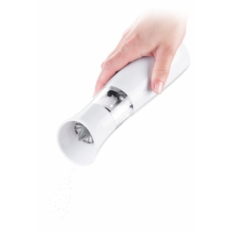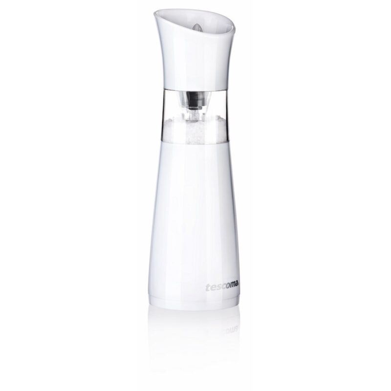 Tescoma Vitamino elektrický mlynček na soľ. Vynikajúci pre dochucovanie pokrmov čerstvo mletou soľou alebo čerstvo mletým čiernym korením, drveným chili, sušeným tymianom a rozmarínom apod. Mlynček začne mlieť automaticky pri otočení hore dnom a vypne pri otočení späť. Vybavené prvotriednym keramickým mlecím mechanizmom s nastaviteľnou hrubosťou mletia a výkonným motorom. Vyrobené z odolného plastu, poháňané 6 tužkovými batériami AAA 1,5 V (nie sú súčasťou balenia). 3 roky záruka.