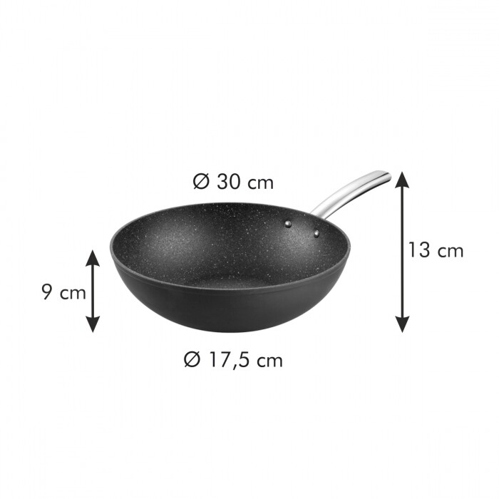 Panvica Wok PRESIDENT značky Tescoma, to je luxusný wok s unikátne zvrásneným antiadhéznym povlakom.Panvica Wok má špeciálne upravený povrch s charakterom nelešteného prírodného kameňa, môžete v ňom intenzívne smažiť aj na minimálnom množstve oleja. Pripravené pokrmy budú vďaka špeciálne štruktúrovanému povrchu woku rovnomerne prepečené, vláčne a krehké.Vysoko odolný antiadhézny povlak si perfektne rozumie nielen s plastovým či dreveným kuchynským náradím, ale spoľahlivo odolá aj kovovým obracačkám. Masívna celonerezová rukoväť je k nádobe woku pevne uchytená 2 kovovými nitmi. Wok neobsahuje žiadne plastové časti a môžete ho používať aj v rúre na pečenie pri dopekaní pokrmov. Wok je vhodný pre všetky typy sporákov, možno ho použiť vo všetkých rúrach. Vhodné do umývačky riadu. Záruka 5 rokov.Materiál: masívny wok s vysoko odolným antiadhézny povlakom, rukoväť z prvotriednej nehrdzavejúcej ocele.