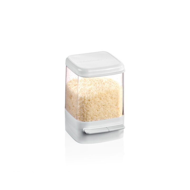 Moderné kuchynské dózy sú vynikajúce na hygienické uloženie pokrmov v chladničke. Táto zdravá dóza je vynikajúca na uloženie a skladovanie strúhaného parmezánu v chladničke. Dóza je vybavená dávkovačom pre malú alebo veľkú porciu parmezánu a odnímateľným viečkom pre ľahké plnenie.Dóza je vyrobená zo špičkového plastového materiálu určeného pre zdravotníctvo a farmáciu. Použitý materiál je neutrálny, nijako neovplyvňuje kvalitu parmezánu ani pri dlhodobom skladovaní.Dózy sú vyvinuté tak, aby boli dokonale stohovateľné, je možné ich navzájom skladať na seba a skladovať v najrôznejších zostavách, ktoré výrazne ušetria miesto v chladničke. Dózy možno vďaka praktickým uzatváracím krídelkám ľahko otvoriť a uzavrieť.