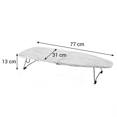 Kompaktná žehliaca doska na úsporu miesta pri žehlení. Používa sa na stole alebo inej pracovnej ploche. Pevná žehliaca doska s dostatočne veľkou plochou je opatrená dierovaním, ktoré zabraňuje nežiaducemu zrážaniu pary. Bavlnený poťah s kvalitným plsteným polstrovaním je vynikajúci na komfortné a plynulé žehlenie.Dosku ľahko rozložíte a zložíte, účinné EVA protišmyky zaisťujú jej stabilitu pri žehlení a zároveň chránia povrch stola.Parametre: