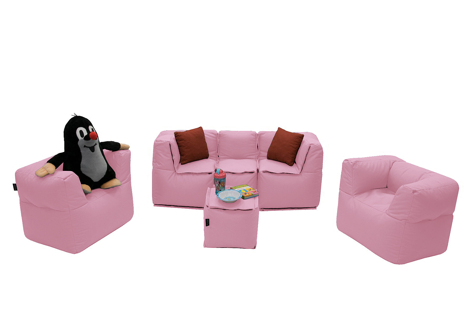 Sestava obsahuje: 2x Záhradné detské textilné kreslo MODULTEX KIDS (ružová), 2x Záhradný detský textilný rohový diel MODULTEX KIDS (ružová), 1x Záhradný detský textilný stredový diel MODULTEX KIDS (ružová), 1x Záhradný detský textilný stolík/taburet MODULTEX KIDS (ružová)