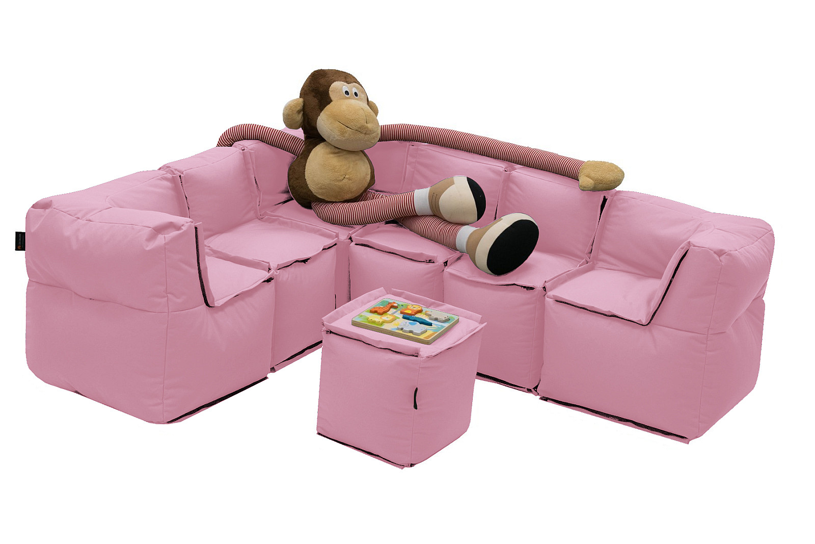 Sestava obsahuje: 3x Záhradný detský textilný rohový diel MODULTEX KIDS (ružová), 3x Záhradný detský textilný stredový diel MODULTEX KIDS (ružová), 1x Záhradný detský textilný stolík/taburet MODULTEX KIDS (ružová)