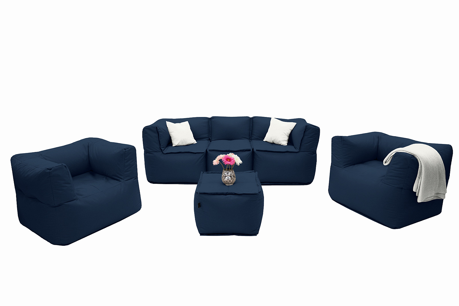 Sestava obsahuje: 2x Záhradné textilné kreslo MODULTEX (tmavo modrá), 2x Záhradný textilný rohový diel MODULTEX (tmavo modrá), 1x Záhradný textilný stredový diel MODULTEX (tmavo modrá), 1x Záhradný textilný stolík/taburet MODULTEX (tmavo modrá)