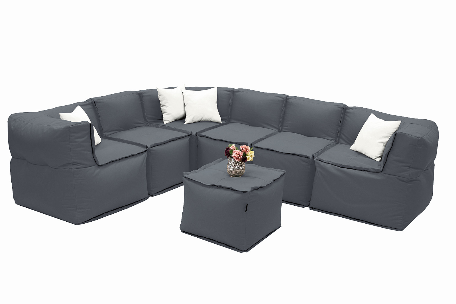 Sestava obsahuje: 3x Záhradný textilný rohový diel MODULTEX (sivá), 3x Záhradný textilný stredový diel MODULTEX (sivá), 1x Záhradný textilný stolík/taburet MODULTEX (sivá)